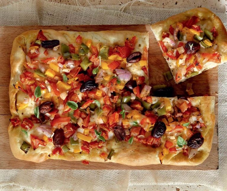 Η λαδένια Κιμώλου έχει χοντρή ζύμη σαν ψωμιού, όποτε χρειάζεται παραπάνω ψήσιμο από μια κλασική πίτσα με λεπτό ζυμάρι.