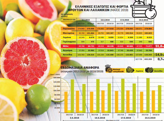 Επίσης συνεχίζονται και οι εξαγωγές λεµονιών, αγγουριών και µήλων µε κανονικούς για την εποχή ρυθµούς και αυξηµένα ποσοστά έναντι αντίστοιχης περσινής εµπορικής περιόδου. Ειδικότερα στα µήλα, η συνολική αύξηση είναι της τάξης του 51,8%, µε τις εξαγωγές προς Αίγυπτο να ανέρχονται σε 45.566 τόνους έναντι 19.314 πέρυσι. Ακόµη, συνεχίζονται οι εξαγωγές φράουλας, µε τις ποσότητες εντυπωσιακά αυξηµένες σε σχέση µε την αντίστοιχη περσινή περίοδο, ήτοι σε 40.702 τόνους έναντι 29.856, σηµειώνοντας ρεκόρ όλων των εποχών ως προς τις ποσότητες.