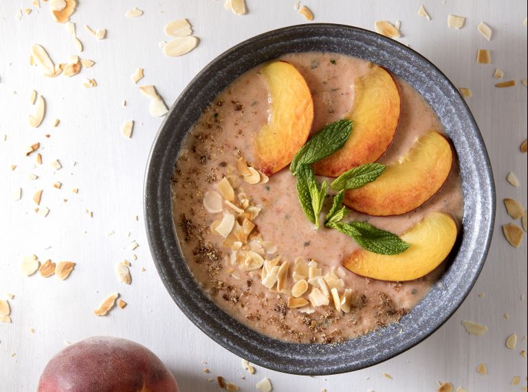 Το επόμενο πρωί βάζουμε πρώτα την παγωμένη μπανάνα σε ένα καλό μπλέντερ ή μούλτι και τη χτυπάμε μέχρι να θρυμματιστεί. Προσθέτουμε το ροδάκινο και πολτοποιούμε. Προσθέτουμε το γιαούρτι, το μέλι και τον δυόσμο και συνεχίζουμε το χτύπημα, μέχρι να αποκτήσει λεία και πηχτή υφή. Σερβίρουμε σε μπολ και γαρνίρουμε με ροδάκινο, λιναρόσπορο, φιλέ αμυγδάλου και δυόσμο.