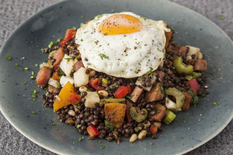 Χορταστική και γευστική σαλάτα με όσπρια, λαχανικά, μυρωδικά, τυρί, αυγό και μανιάτικο αλλαντικό.