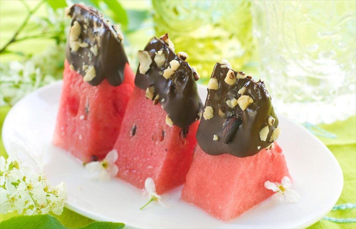 Το κλασικό «κόλπο» που μπορείτε να κάνετε με όλα τα φρούτα, είναι να λιώσετε λίγη μαύρη σοκολάτα σε μπεν μαρί, να βουτήξετε τη μύτη των φρούτων σας σε αυτή και στη συνέχεια να τα παγώσετε, πασπαλίζοντας λίγους ξηρούς καρπούς. Έτσι θα έχετε υπέροχες γλυκές, σοκολατένιες μπουκιές καρπουζιού που θα λατρέψουν μικροί και μεγάλοι.