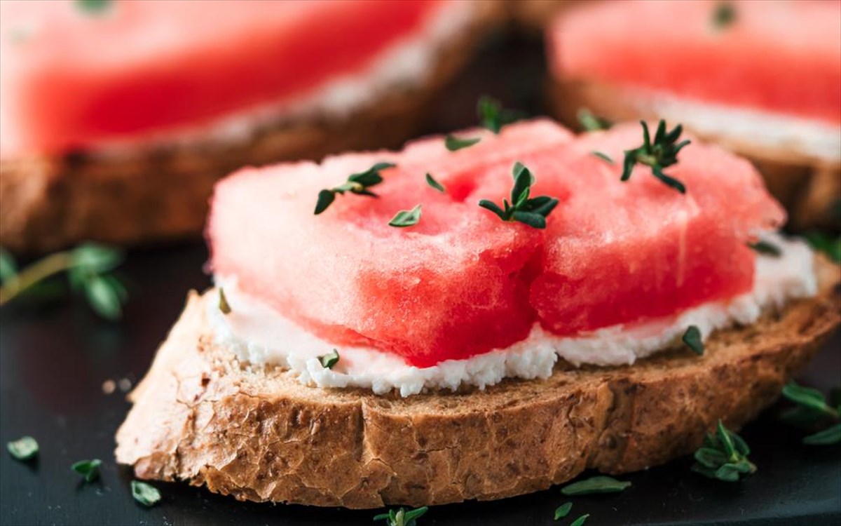 Η κλασική, ιταλική μπρουσκέτα περιέχει ελαιόλαδο, σκόρδο, ντομάτα και βασιλικό πάνω σε φρυγανισμένο ψωμάκι. Τι θα λέγατε, όμως, να κρατήσουμε το ψωμάκι και να αντικαταστήσουμε τα υπόλοιπα με τυρί κρέμα και λίγο δροσερό καρπούζι ως τόπινγκ ή εναλλακτικά να δώσετε στο καρπούζι τη θέση της ντομάτας. Δοκιμάστε το!