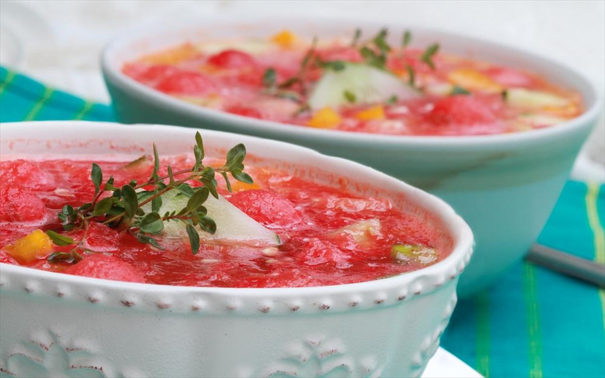 Το γκασπάτσο είναι μια πασίγνωστη κρύα σούπα με βάση την ντομάτα και άλλα λαχανικά, ισπανικής προέλευσης, που το καλοκαίρι κάνει θραύση. Αντί για ντομάτα, μπορείτε και πάλι να χρησιμοποιήσετε καρπούζι και να φτιάξετε τη δική σας δροσερή εκδοχή.