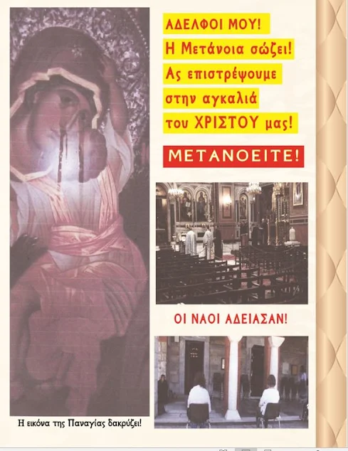 _____Τις ημέρες αυτές θέτουμε σε κυκλοφορία ένα μικρό τετρασέλιδο φυλλάδιο, στις γραμμές του οποίου εκφράζουμε για μια ακόμη φορά την αγωνία της ψυχής μας, διότι Η ΟΡΘΟΔΟΞΙΑ ΜΑΣ ΠΡΟΔΟΘΗΚΕ! Επειδή, λοιπόν, το lockdown δυστυχώς, δυστυχέστατα, εδώ στην δύστυχη Ελλάδα όχι μόνον συνεχίζεται, αλλά και παρατείνεται, δεν έχουμε την δυνατότητα να το μοιράσουμε «χέρι με χέρι»! Το παραθέτουμε, λοιπόν, στη συνέχεια εδώ στην ιστοσελίδα μας και παρακαλούμε ικετευτικά όσους θα το διαβάσουν και θα πονέσουν επίσης μαζί μας, γονυπετείς να κάνουμε μια θερμή προσευχή και να παρακαλέσουν την Υπεραγία Θεοτόκο να διαλύσει τις δυνάμεις του σκότους, που έχουν σχεδιάσει όλο αυτό το εργαλείο του Κορωνοϊού, για να διαλύσουν την Κοινωνία σε παγκόσμια κλίμακα. Να παρακαλέσουμε τον Πανάγαθο Θεό να μη μας εγκαταλείψει και να μας δώσει μετάνοια, ώστε να ξαναγυρίσουμε σύντομα στον Οίκο Του και στην αγκαλιά Του. Η Παναγία μας, η Οποία συνεχώς δακρύζει εκεί ψηλά στην περιοχή του Βύρωνα (Αττικής), να μας σώσει! Να σώσει την Ορθόδοξη Ελλάδα μας!