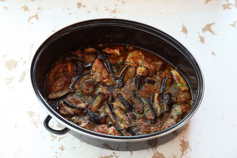 Προσθέτουμε στη γάστρα τις μελιτζάνες και μαγειρεύουμε για μισή ώρα ακόμη με το καπάκι κλειστό. Το σερβίρουμε στην πιατέλα με πατάτες τηγανητές και φέτα.