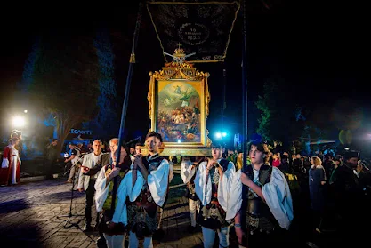 Ακολούθησε η λιτανευτική πομπή, με επικεφαλής την Εικόνα της Εξόδου, τον Σταυρό Ευλογίας του Επισκόπου Ρωγών και το Ιερό Λάβαρο, από τον Ιερό Ναό στον Κήπο των Ηρώων. Στην ιερά λιτανεία συμμετείχαν οι Άγιοι Αρχιερείς, ο Ιερός Κλήρος και οι αρχές του τόπου, ενώ προηγήθηκαν μαθητικές αντιπροσωπίες των Σχολείων της Ιεράς Πόλεως, μέλη πολιτιστικών και αθλητικών συλλόγων του Νομού Αιτωλοακαρνανίας και άλλων Νομών, φιλαρμονικές και τιμητικά αγήματα των τριών Σωμάτων του Ελληνικού Στρατού.